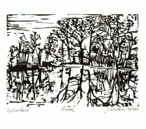 In den vergangenen Jahren schuf Jens Kirsten eine Reihe Holzschnitte, die vorwiegend als Freundesgaben in kleiner Auflage entstanden. Seine landschaftlichen Erkundungen richten sich vor allem auf das Vorland des Thüringer Waldes zwischen Weimar und Rudolstadt oder auf das Thüringer Holzland. Bei seinen Wanderungen fallen ihm besondere Sujets auf. Sei es ein Waldgarten, eine Dorfansicht, ein Weg am Ortsrand, ein verfallenes Bauerngehöft, eine Scheune, eine Brücke bei Hochwasser. Es sind stille Fundstücke, die die Schönheit des Augenblicks im Bild bewahren.