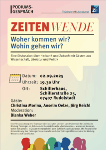 Veranstalter/ Koope­ra­ti­ons­part­ner: Die vier­tei­lige Gesprächs­reihe »Zei­ten­wende – woher wir kom­men, wohin wir gehen« ist eine gemein­same Reihe der Lan­des­zen­trale für poli­ti­sche Bil­dung in Thü­rin­gen und des Thü­rin­ger Lite­ra­tur­ra­tes e.V. Koope­ra­ti­ons­part­ner für diese Ver­an­stal­tung ist das Schil­ler­haus Rudol­stadt. Mit freund­li­cher Unter­stüt­zung des Thü­rin­ger Mini­ste­ri­ums für Bil­dung, Wis­sen­schaft und Kul­tur und der Thü­rin­ger Staatskanzlei.
