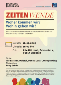 Veranstalter/ Kooperationspartner: Die vierteilige Gesprächsreihe »Zeitenwende – woher wir kommen, wohin wir gehen« ist eine gemeinsame Reihe der Landeszentrale für politische Bildung in Thüringen und des Thüringer Literaturrates e.V. Kooperationspartner für diese Veranstaltung ist die Lippmann+Rau Stiftung Eisenach. Mit freundlicher Unterstützung des Thüringer Ministeriums für Bildung, Wissenschaft und Kultur und der Thüringer Staatskanzlei.
